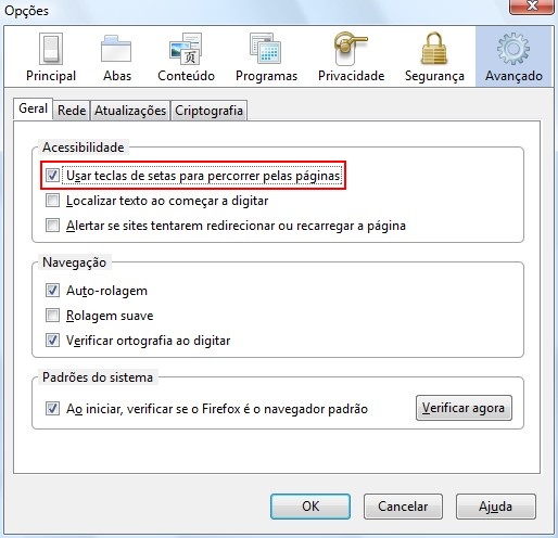 E se, por acaso, você quiser deixar o recurso habilitado sempre, basta acessar o Menu Ferramentas > Opções. Clique na aba Avançado e deixe marcada a opção “Usar teclas de setas para percorrer pelas páginas“. Tecle Enter ou clique em Ok.